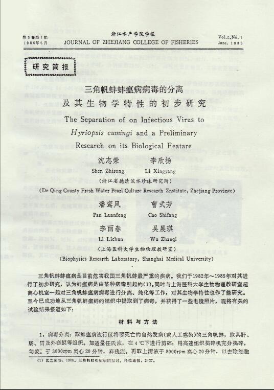 ▲沈志荣针对蚌瘟病进行研究,其成果刊载于1993年《病毒学报》其后他进一步对三角帆蚌蚌瘟病病毒的精细结构与基因组及多肽进行研究,提出了蚌瘟病的有效防控措施,并在全国范围内取得显著成效。至此,中国现代珍珠培育技术基本成形。