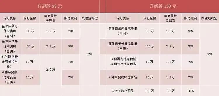 升级版:150元保一年,最高400万医疗保障。保障责任包含:基本医保目录内住院医疗费用,最高保障100万元,年度免赔额1.2万元,赔付比例90%;基本医保目录外住院医疗费用,最高保障100万元,年度免赔额2.2万元,赔付比例70%;34种国内特定药械费用,最高保障80万元,年度免赔额1.2万元,赔付比例70%;6种罕见病特定药品费用,最高保障20万元,年度免赔额1.2万元,赔付比例70%,2种CAR-T治疗药品费用,最高保障100万元,报销比例100%。