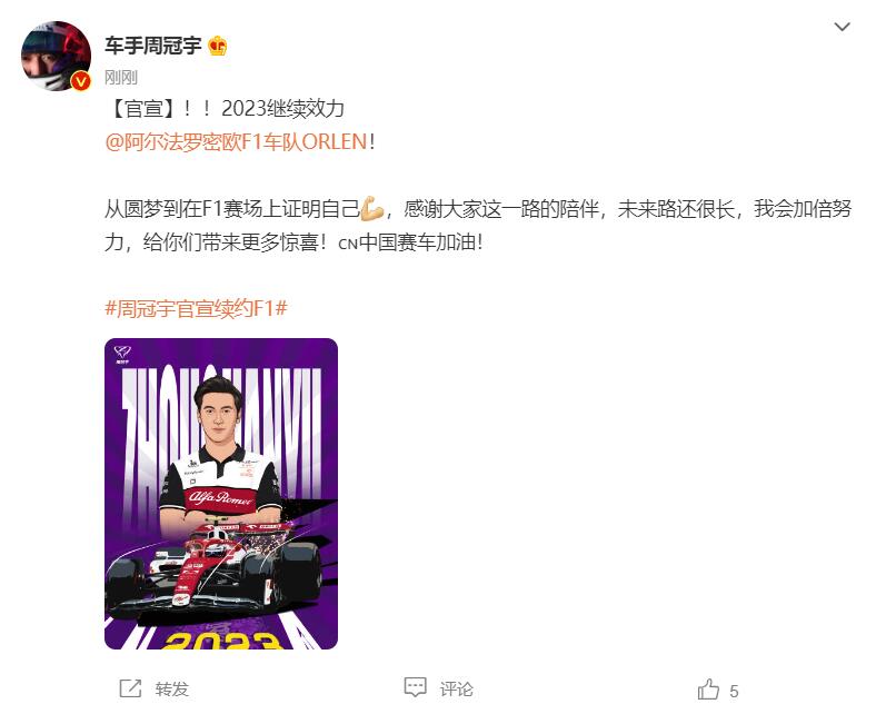 周冠宇将继续征战F1。 本文图片来源:周冠宇微博