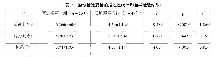 高道德组的第三方在道德品质上的得分更高(表3)。高道德组在掩蔽词上也得到更高的分数,可能源于宜人性内容与道德维度的交叉。总体而言,实验成功地操纵了第三方的道德声誉。