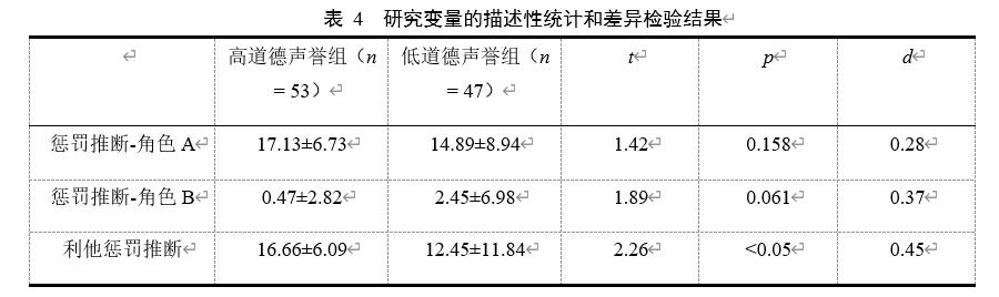将两个惩罚推断的分数相减作为利他惩罚推断分数,即利他惩罚推断=惩罚推断角色A-惩罚推断角色B。独立样本t检验表明,高道德声誉组认为第三方针对角色C的利他惩罚水平显著高于低道德声誉组(见表4)。