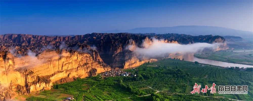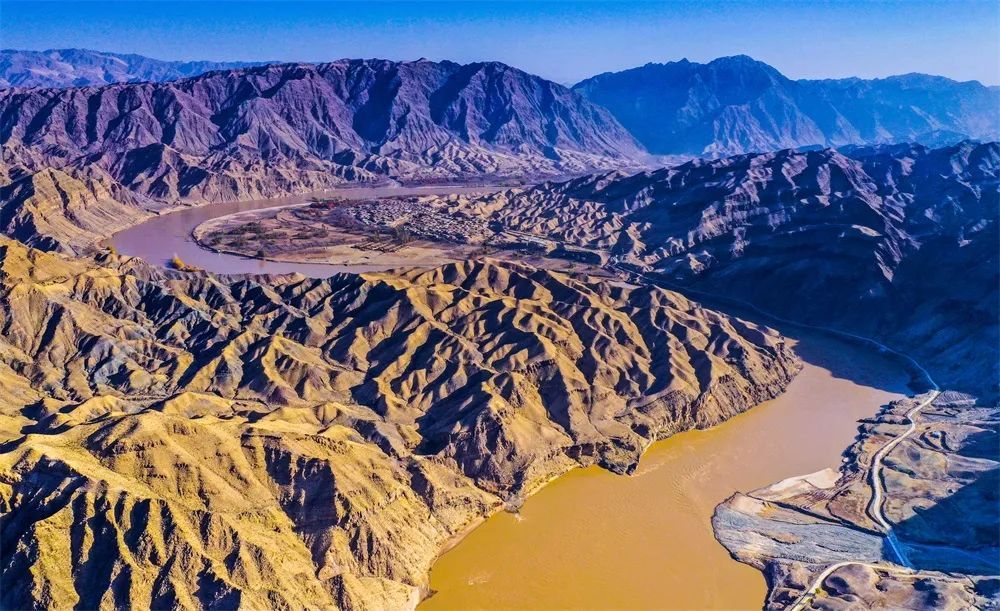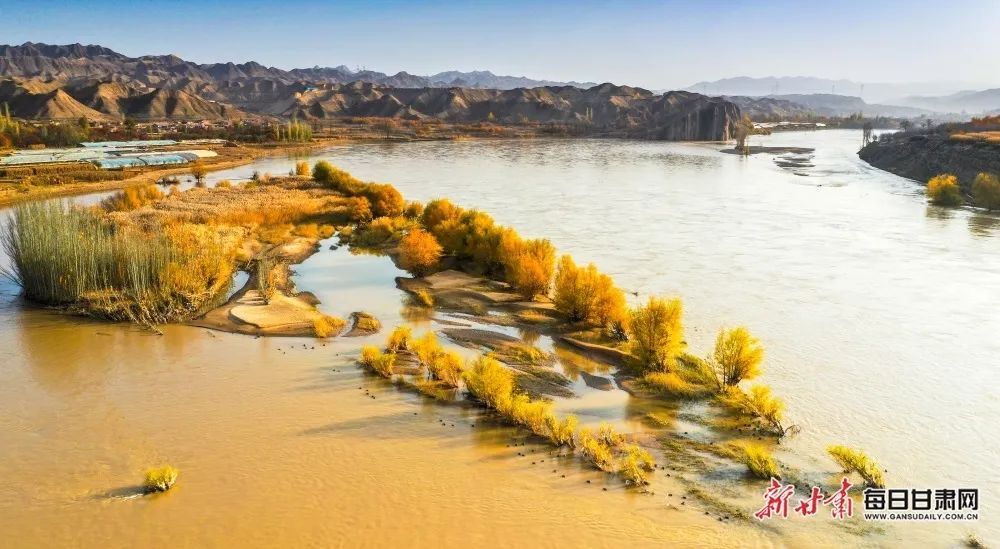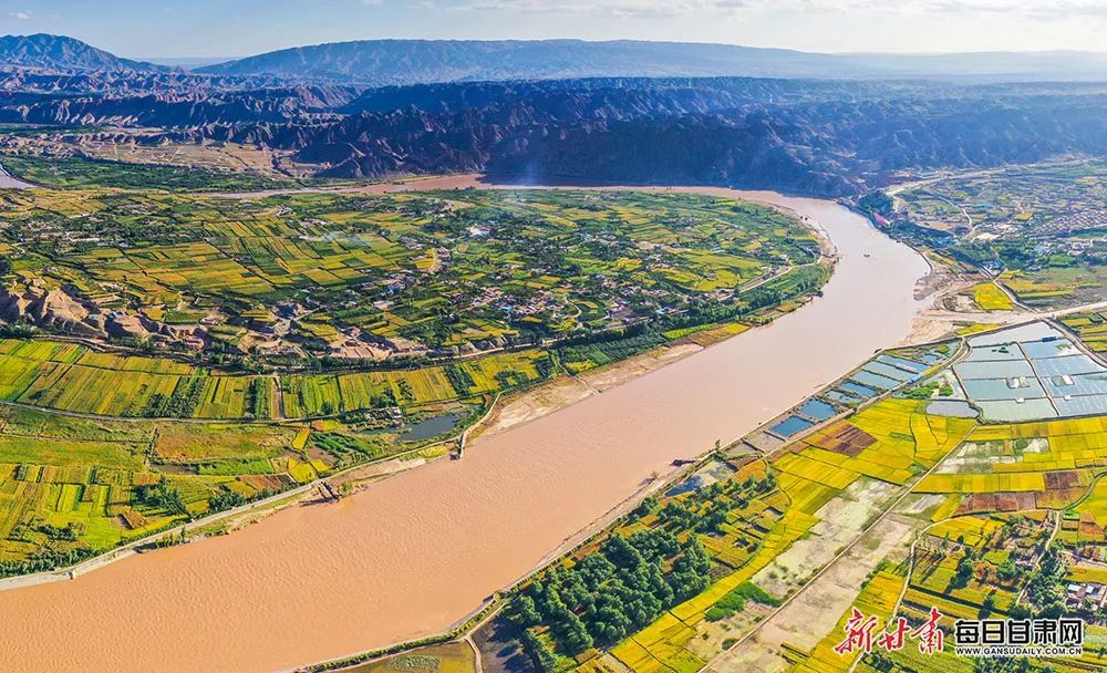 金秋时节,大地流金。白银市景泰县黄河两岸仿佛一个巨大的调色盘,万亩良田黄绿相间、色彩斑斓,村庄瓦舍星罗棋布、点缀其间。潺潺的河水与周围景物相互映衬,勾勒出奇美壮丽的黄河画卷。