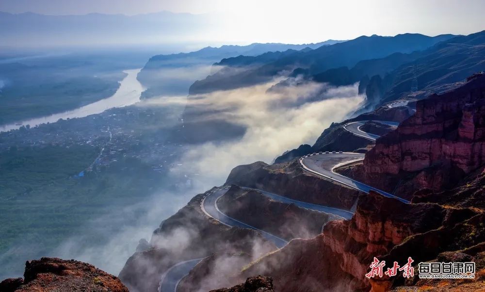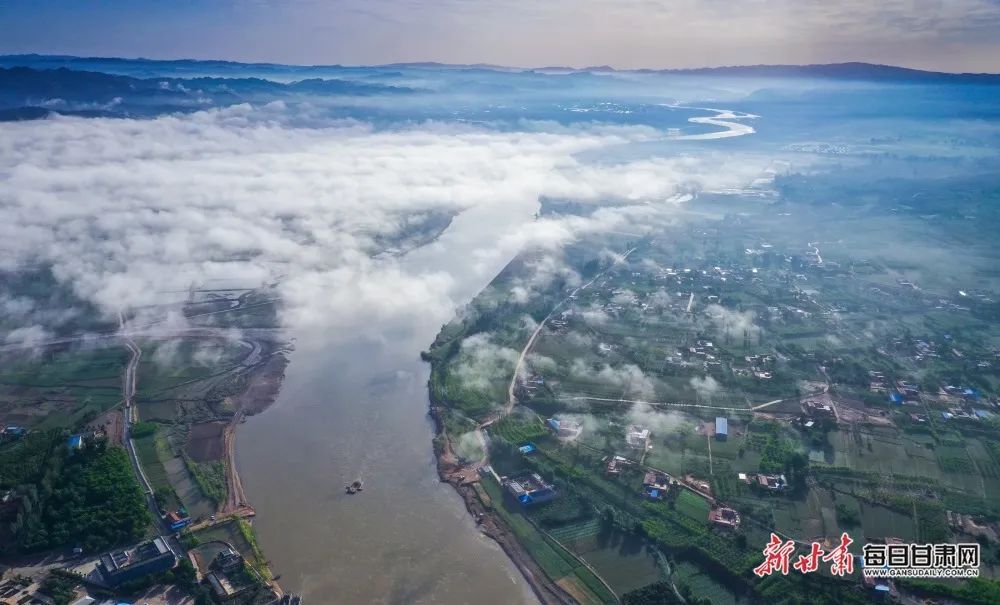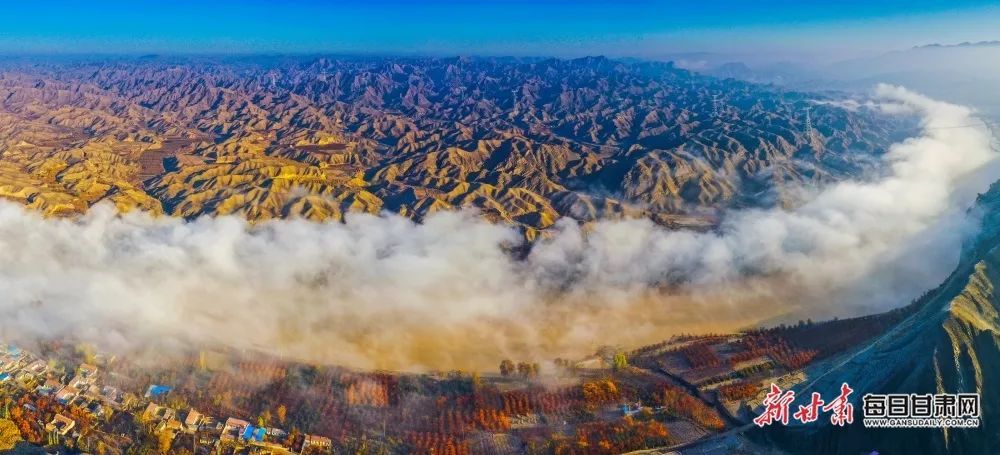 秋日清晨,云雾环绕下的景泰县五佛乡金坪村与靖远县兴隆乡大庙村交界处河流。