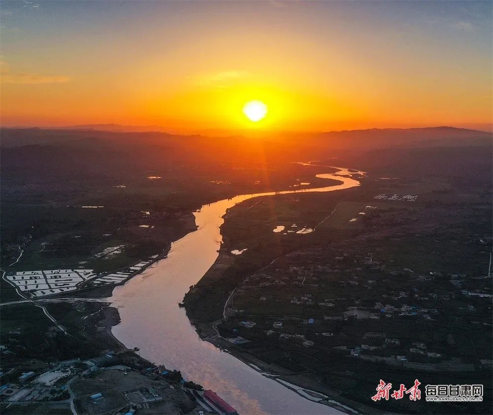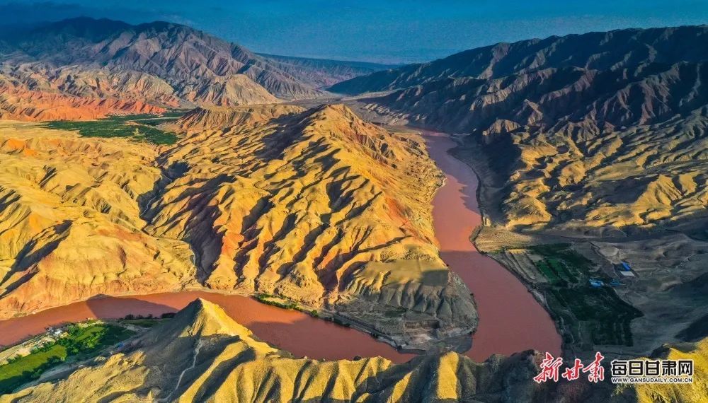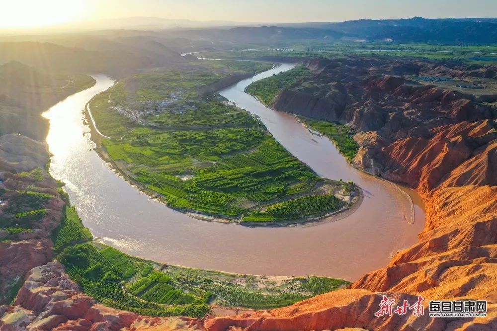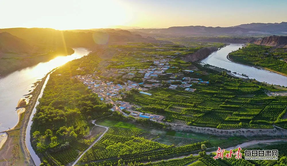 黄河上游景泰县五佛平原,河流装满河道,满载运行,山脉、田畴、沃野、村庄在夕阳中熠熠生辉。