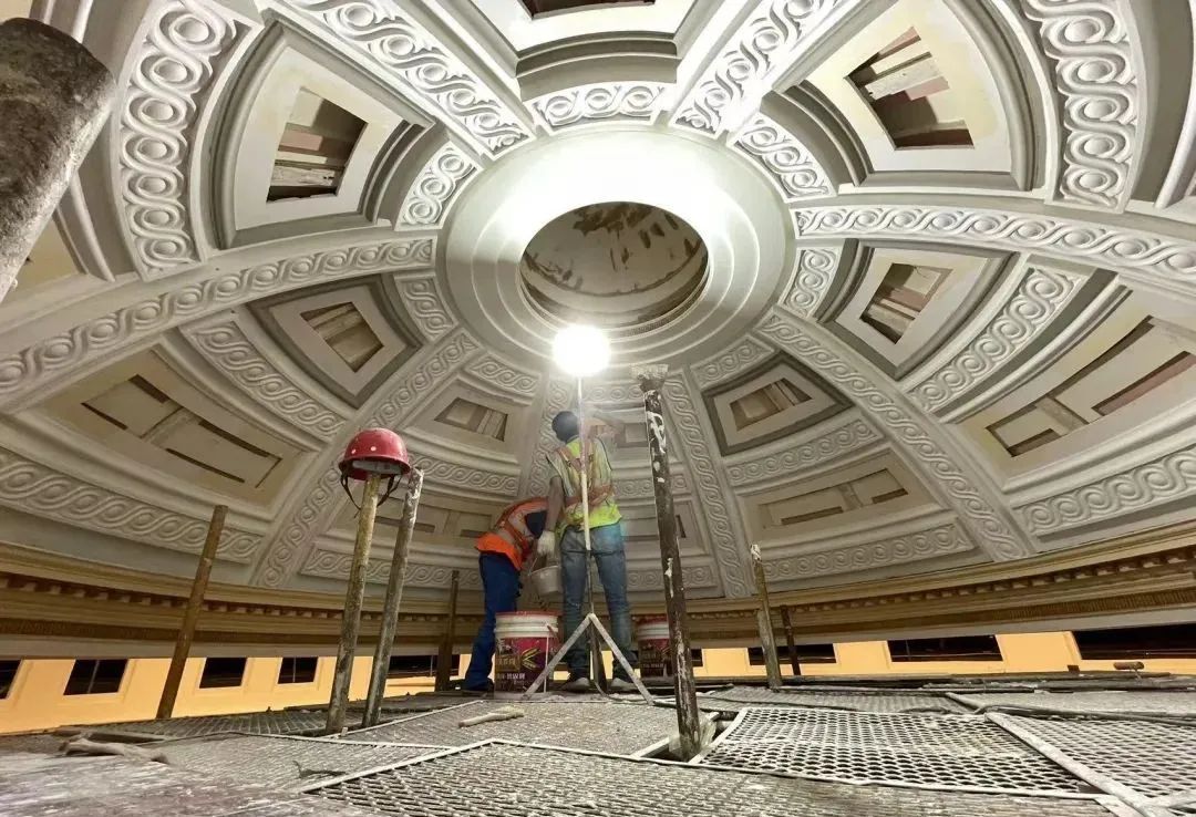 观众厅的圆穹顶,是兰心的一个标志性部位。在检测结构安全的前提下,修缮团队灵活使用现代技术,对穹顶进行修补和增强,并在关键部位安装监测传感设备,对其服役状态进行实时动态监测,保障剧场的安全使用。