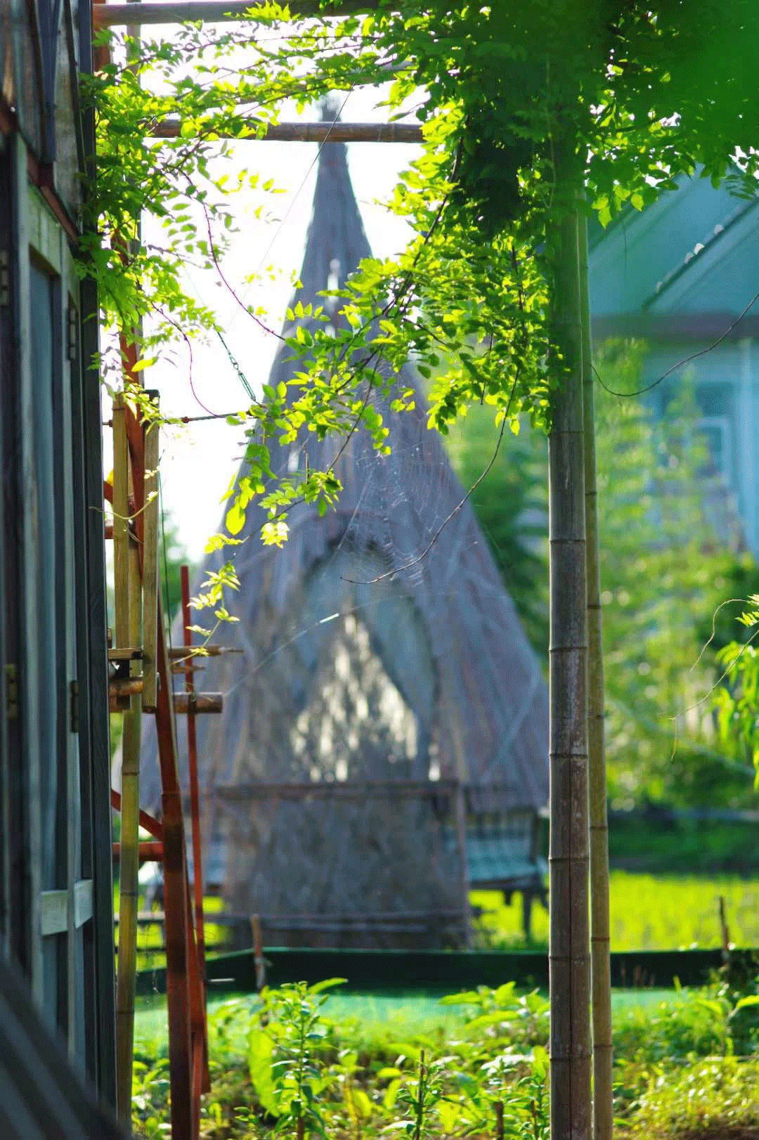 人,也是这生态系统的一部分。椿庭的2个主要卫生间/淋浴间都在稻田里,分别叫“月光1号”和“月光2号”。圆锥体一般的月光号,由竹子及崇明土布作围挡,围挡下端镂空,这样一来,人待在里面,也能看到一隅稻田、感受四面风来。