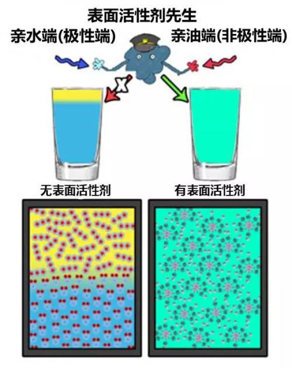 表面活性剂(surfactant)指的是一类能够降低液体表面张力的化合物,是一种“两亲”分子,既能和水分子亲热,也能和油分子亲热。