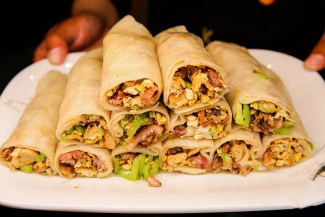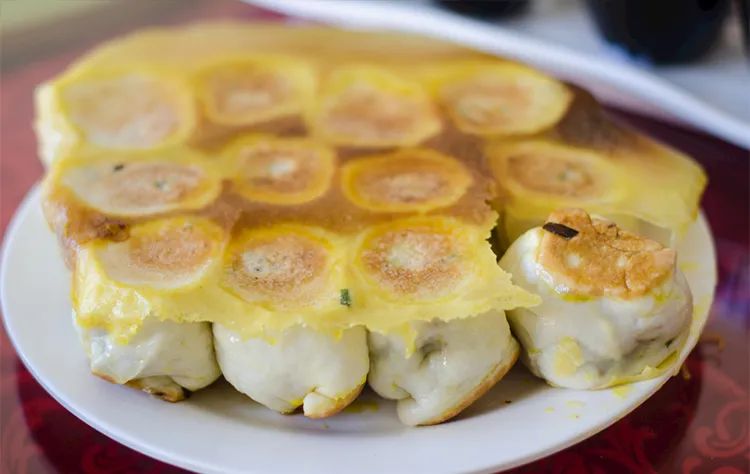锅子饼是山东滨州市特色传统名吃之一,先用软面做两个小饼,在鳌子上烙黄备用,再用鸡蛋、熟肉、豆腐、香菜制馅,卷入饼中,煎一下,切成块就可以食用了。