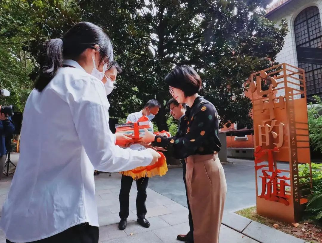 ▲ “世纪火种”党建品牌单位联盟向百代小楼赠予红色主题书籍由著名作曲家吕其明创作的