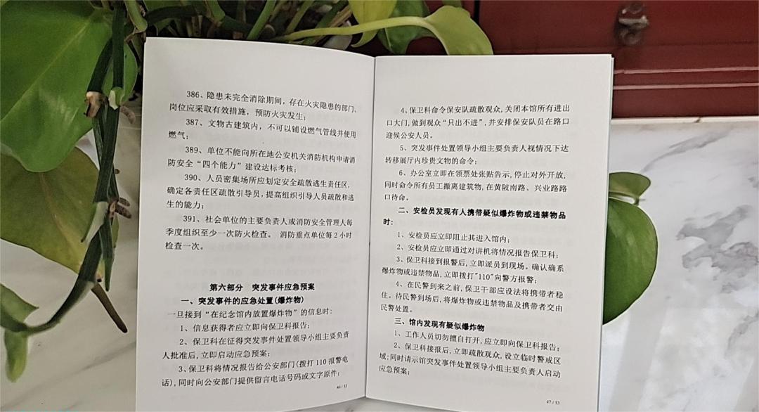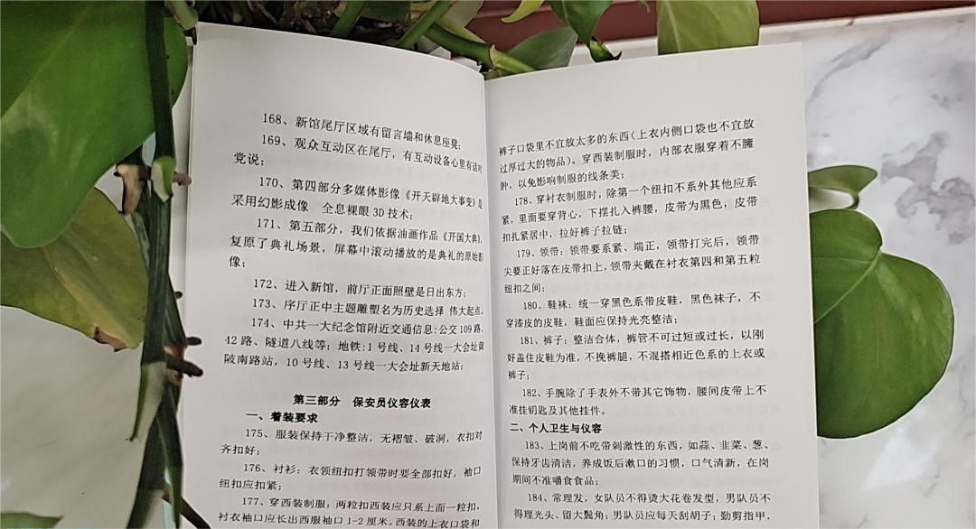 △左滑查看更多手册明确了保安员每日工作清单和工作标准,从工作广度和深度上更加精确化。通过在保安队早班会上组织全体队员开展晨读学习、集体讨论、竞赛抢答等形式,举一反三,潜移默化,使大家立足本职工作,强化思想政治意识,丰富党史和馆务知识,强化履职技能,普及法规,淬炼战斗力,全方位塑造中共一大纪念馆保安精神风貌和提升履职能力。他们以文明专业的服务,正在感动着更多的参观者。