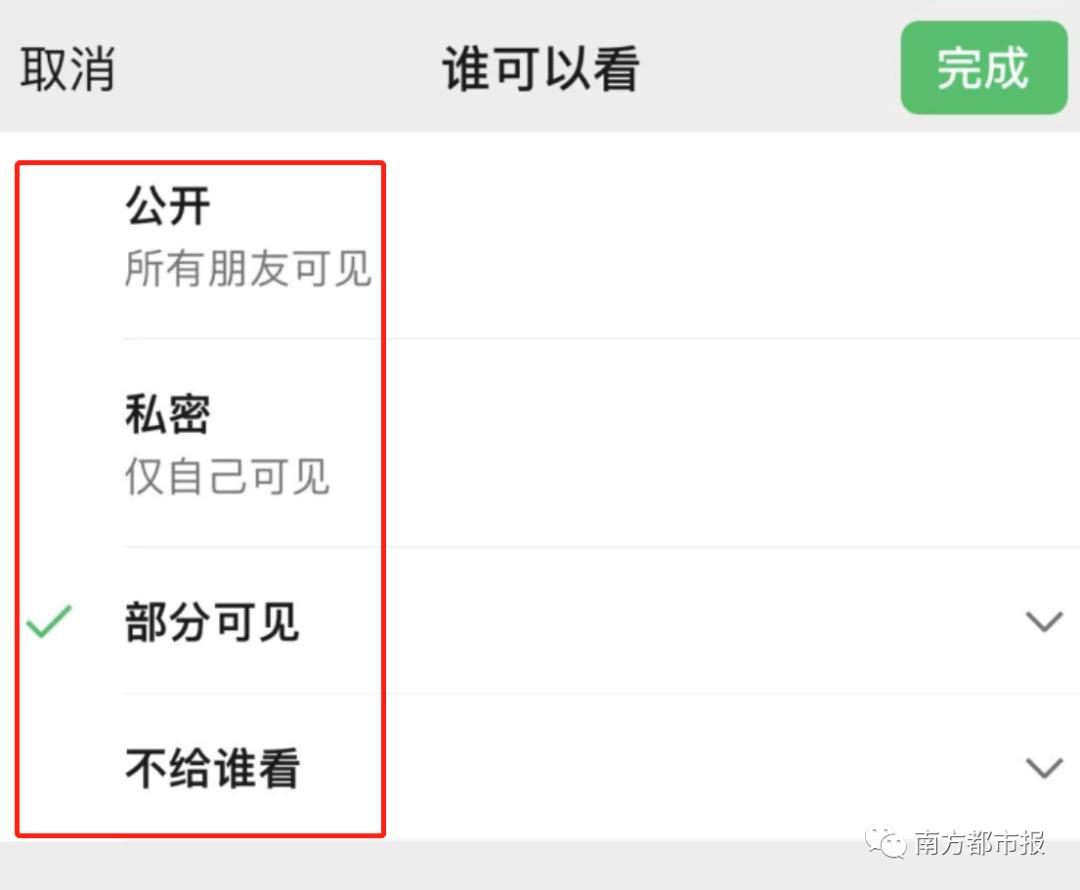 随后用户可自行修改可见范围的权限包括公开、私密、部分可见、不给谁看等