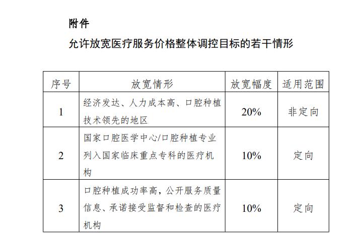 · 允许经济发达、人力等成本高的地区,口腔种植专业列入国家临床重点专科的医疗机构等,根据本地实际放宽医疗服务价格调控目标,放宽比例不超过20%。