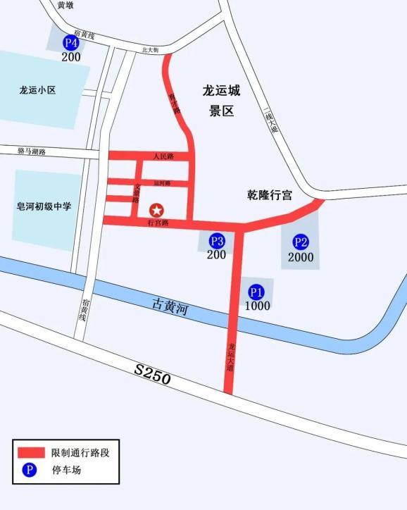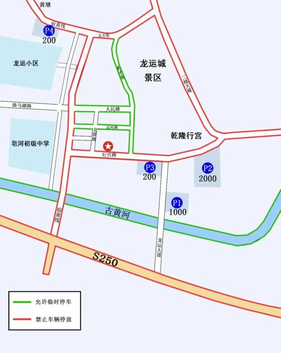 所有游客车辆原则上进入周边停车场停放,待所有停车场停满后,景区周边的育才路、人民路、运河路、古黄河南岸、北岸道路允许临时单排顺向停放;宿黄线、二线大堤、北大街、行宫路及250省道全段禁止所有车辆占道停放。