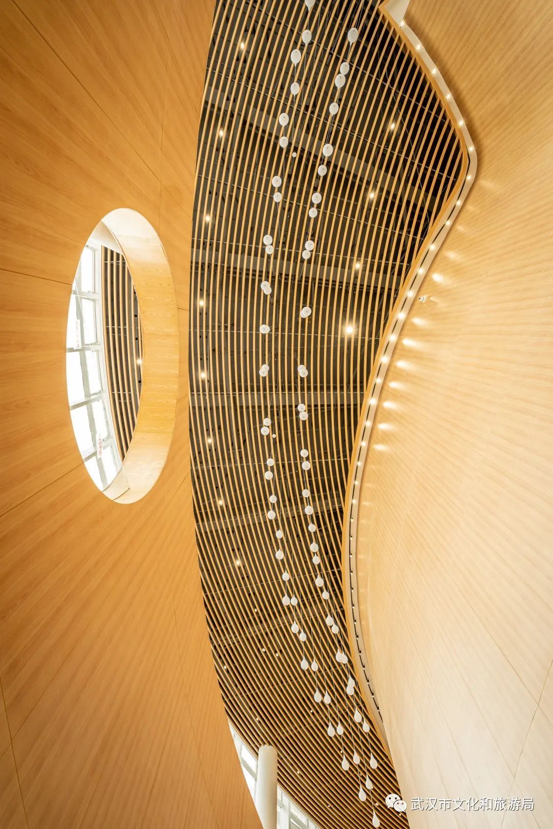走进剧院大厅,会感觉自己走进了一座音乐殿堂,原木镂空吊顶如五线谱,灯串像流动的音符,璀璨烂漫。