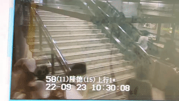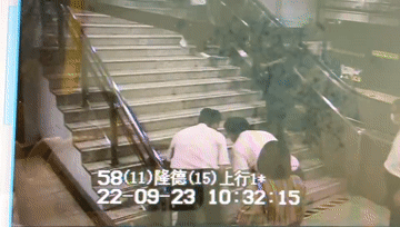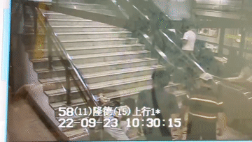 9月23日上午10:30,轨交11号线隆德路站站内扶梯处,一女乘客突发晕眩,面朝楼梯倒下。“你怎么,要紧吗?”“站务员,这里有人晕倒啦。”“你是低血糖了吗?”一位穿深色T恤的乘客赶紧上前查看她的情况。