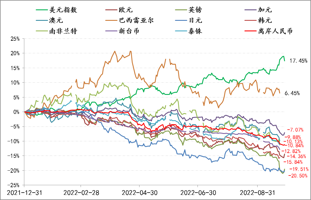 截至目前(9月28日),美元指数已累计升值近19%,相应多数非美货币均呈现贬值态势(巴西雷亚尔则累计升值了6.45%),尤其是英镑与日元累计贬值幅度超过了20%,欧元和韩元则累计贬值了15%以上,新兴市场货币贬值幅度也都不低,新台币贬了13%、泰铢贬了11%、南非兰特贬了11%、人民币贬了11%。