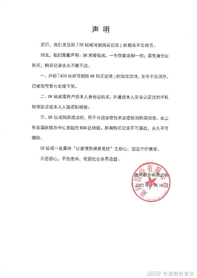 对此,DR随后发布了声明强调道,声称800块即可删除DR购买记录的淘宝店铺,发布不实消息已被淘宝官方处理下架。DR还表示,DR钻戒购买成功后,用不可逆加密技术加密后的购买信息,会上传至国家信息中心发起的BSN区块链。