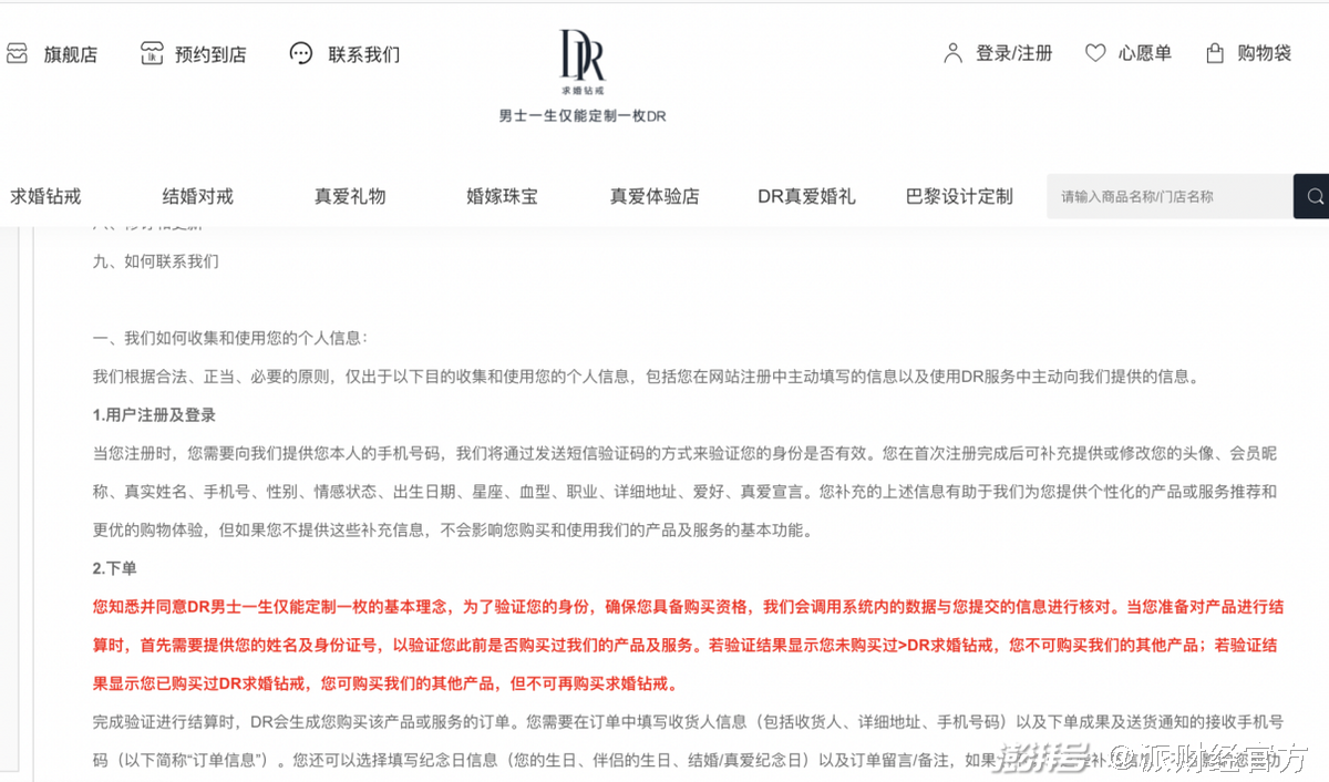 在DR的营销话术中,称DR求婚钻戒一生仅能定制一枚,当男士决定绑定身份信息的那一刻,就默认了女士是他这辈子的偏爱和例外,一辈子不能修改和删除。