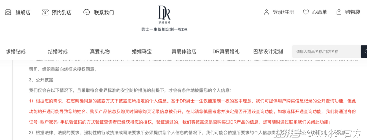 事情曝光两天后,DR钻戒关闭了“真爱验证查询”系统。在DR官网关于用户隐私条款中提到,用户可选择关闭或开启“真爱验证查询”功能。若用户选择开通,DR会通过身份证号、账户密码和手机验证码验证查询者,DR仅对验证通过的查询者开放查询。