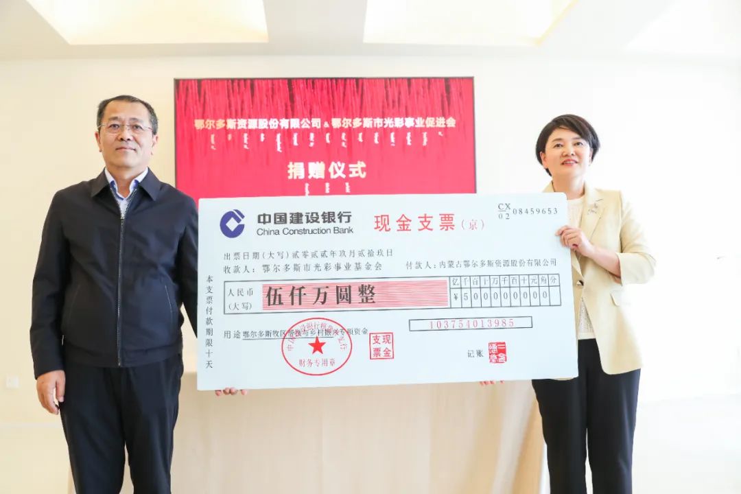 在落成发布仪式上,鄂尔多斯资源股份有限公司向鄂尔多斯市光彩事业促进会捐赠5000万元牧区帮扶与乡村振兴专项基金,助力乡村振兴。鄂托克旗阿尔巴斯苏木牧民代表向鄂尔多斯集团献上刺绣作品。