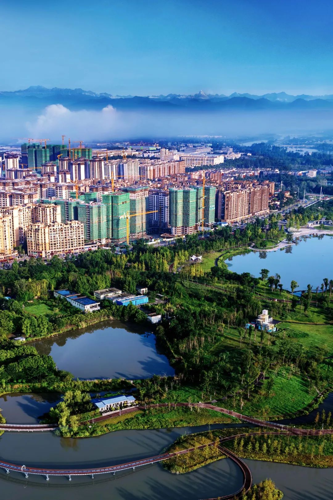 雪山下的新津红石涵养湿地公园。摄影/王战勇
