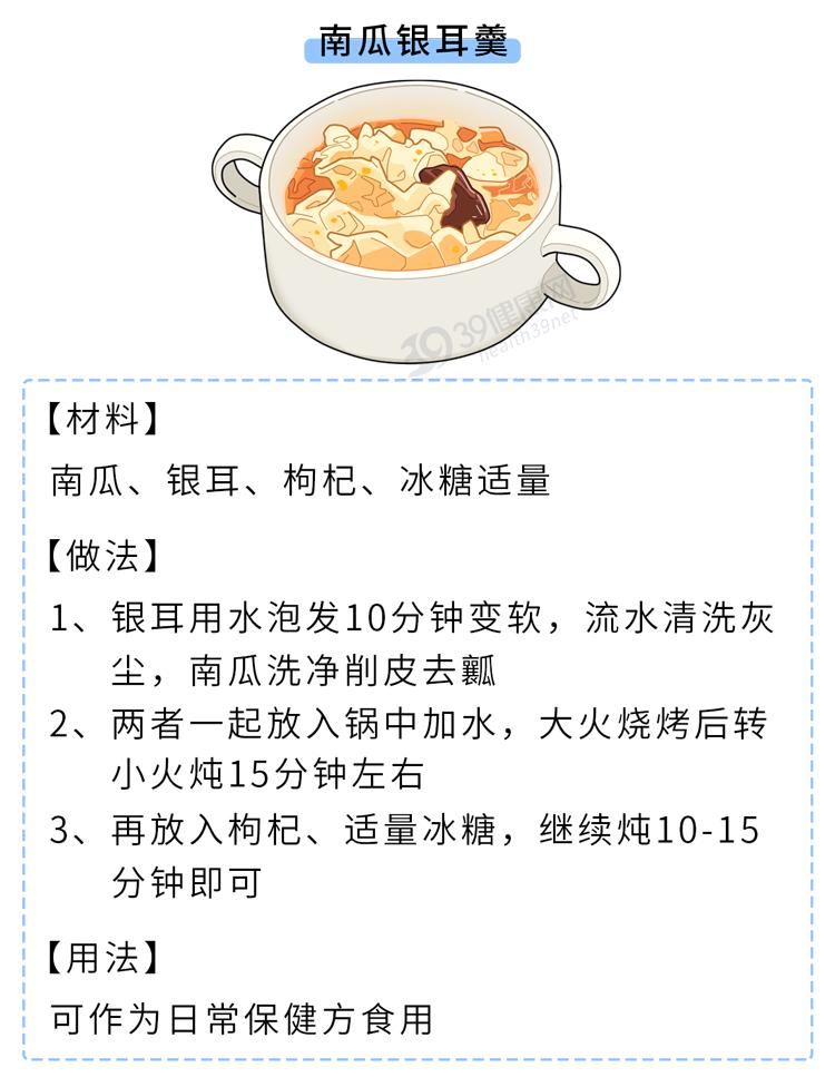 南瓜能补益气血、补肾排毒,还能健脾开胃,适用于气血亏虚、少气懒言者。而银耳味甘性平,滋阴补肾,适用于体虚瘦弱者,两者结合相得益彰。