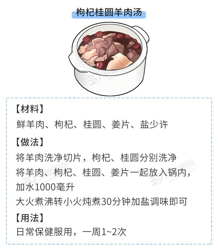假如你非常不幸,阴阳两虚的症状同时并存,既身体发热又虚寒怕冷,那就要阴阳兼顾。日常保健,可以选择一些阴阳同补的食疗方,如:枸杞桂圆羊肉汤。枸杞滋阴,桂圆、羊肉补阳。