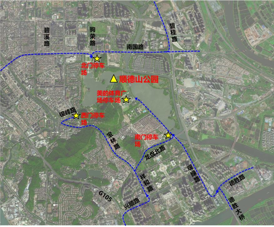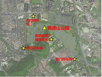 顺峰山公园共开放北门停车场、西门停车场、南门停车场、美的体育广场停车场,共约2000个停车位。