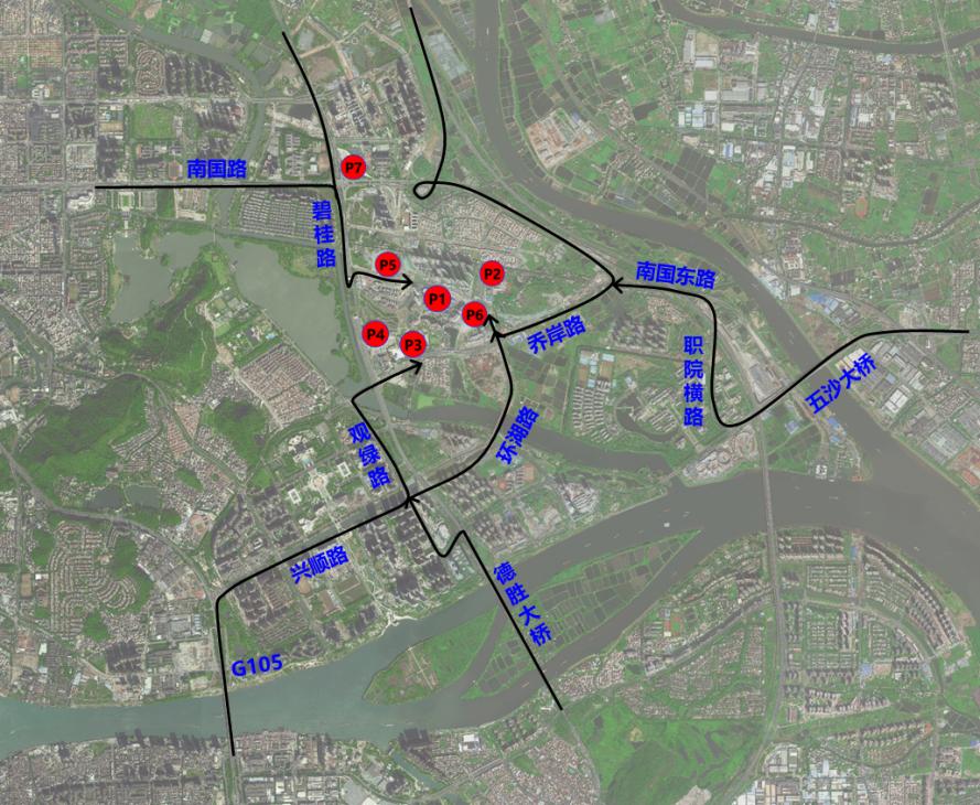 五沙大桥来车:五沙大桥→职院横路→南国东路→乔岸路→P6、P2停车场。