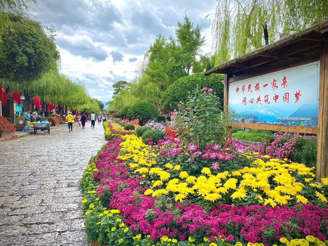 精品大菊、球形碎菊、什锦菊……游览古城的沿途都有这些美丽的花儿相伴,心情都变得美滋滋。在东大街、四方街、大石桥等主要区域和街道,菊花依次娇艳地绽放,衬得古城的小桥流水更有韵味了,也成了一道亮丽的秋景。