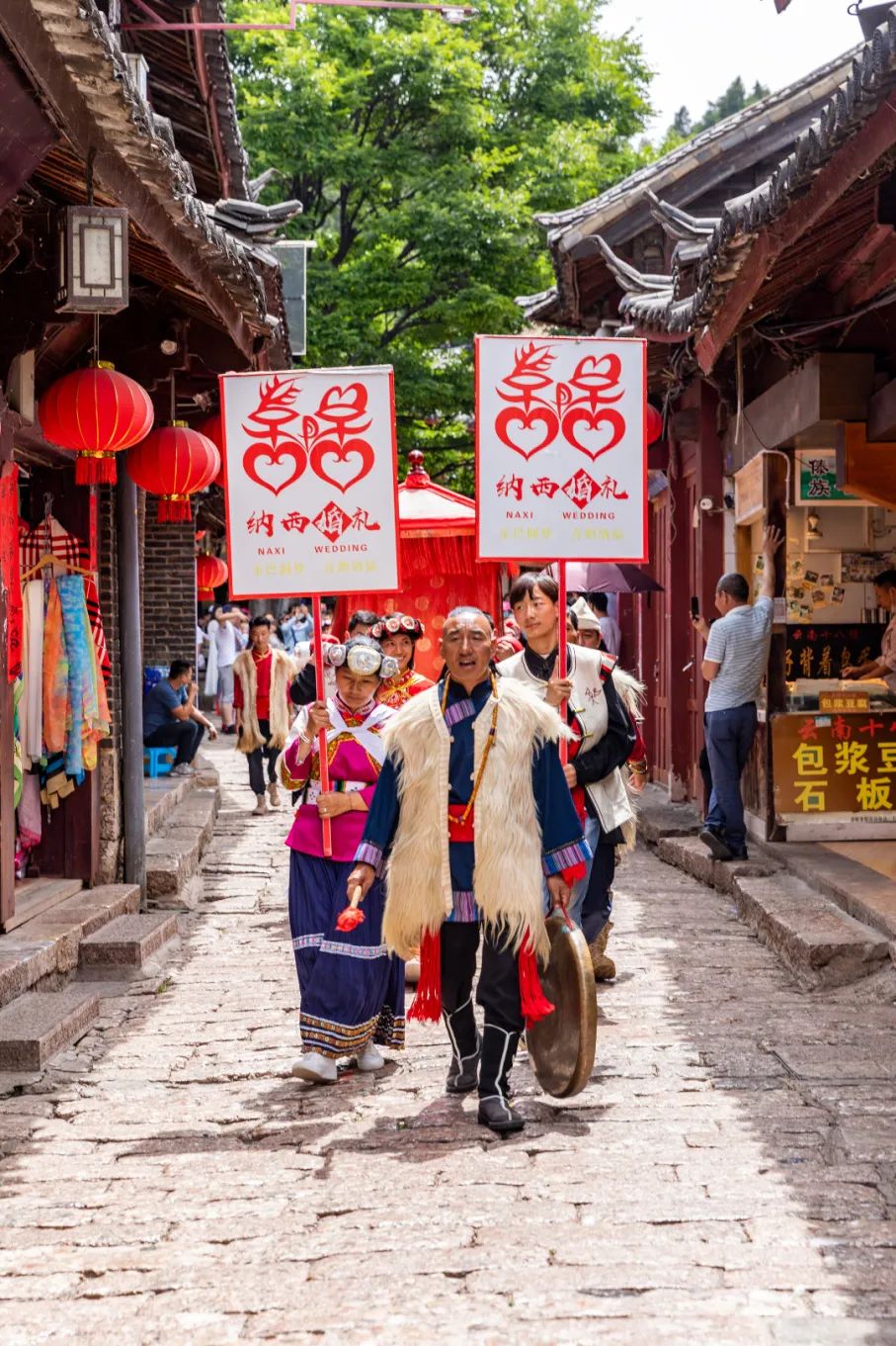 那我们去古城看一场纳西婚俗展演吧,身临其境地走进东巴婚礼的现场,体验有趣的纳西族婚礼习俗。在《嫁女调》歌声中,母亲不舍地为出嫁的女儿梳着头,接亲队伍浩荡而来,新郎将心爱的姑娘接上,穿过古城的小桥流水,去到纳西人家。