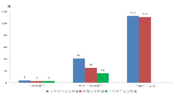 1.从遴选数量看,新增企业多。2022年,全省遴选公布数字经济核心产业领域创新企业316家、比上年增加21家,其中“独角兽”企业10家、“未来独角兽”企业82家,合计比上年增加25家;“瞪羚”企业224家。10家“独角兽”企业中,4家为上年获评“独角兽”企业,3家为新增企业,2家由上年的“未来独角兽”企业成长升级为“独角兽”企业,1家由上年的“瞪羚”企业成长升级为“独角兽”企业。82家“未来独角兽”企业中,41家为上年获评“未来独角兽”企业,25家为新增企业,16家由上年的“瞪羚”企业成长升级为“未来独角兽”企业。224家“瞪羚”企业中,113家为上年获评“瞪羚”企业,111家为新增企业。