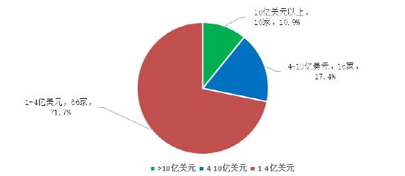2.从市场估值看,发展潜力足。10家“独角兽”企业市场估值约200.3亿美元,平均估值约20亿美元,其中四三九九网络股份有限公司市场估值最大,为47.05亿美元。82家“未来独角兽”企业市场估值约为234.56—239.11亿美元,平均估值2.86—2.92亿美元。“独角兽”“未来独角兽”企业市场估值为1—4亿美元有66家,占比71.7%,比重最高。