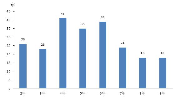 3.从培育周期看,成长速度快。92家“独角兽”和“未来独角兽”企业平均成长时间为10.65年,其中,有23家企业成长时间不超过5年。福建闽光云商有限公司、福建豆讯科技有限公司2家公司不到3年就成长为“独角兽”企业。量子云码(福建)科技有限公司、福建时代星云科技有限公司2家公司不到2年就发展为“未来独角兽”企业。224家“瞪羚”企业平均成长时间为5.21年,其中有49家企业成长时间不超过3年,占比约21.9%。