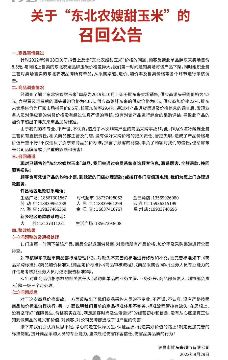 作为东北农嫂下游的分销商,百货公司胖东来宣布召回东北农嫂玉米,其中更是公布了玉米的采购价格: