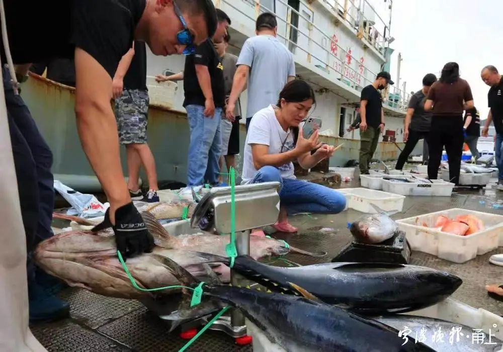 渔商选购金枪鱼。谢定会 摄浙象渔47019兴隆号船老大告诉记者,他们9月23日出海,在海上作业了8天,就是为了赶在国庆假期卖个好价钱,自己也上岸过个好节。