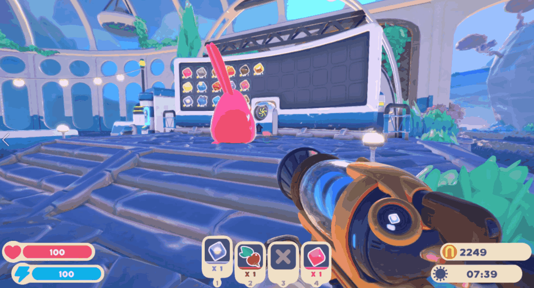 吃过食物之后的史莱姆,就会当场立即生产出结晶。我们再把结晶拉到温室里的售卖展板,就能卖出一个好价钱了。这样就可以建成【 饲养-售卖 】一条龙的史莱姆生产线。
