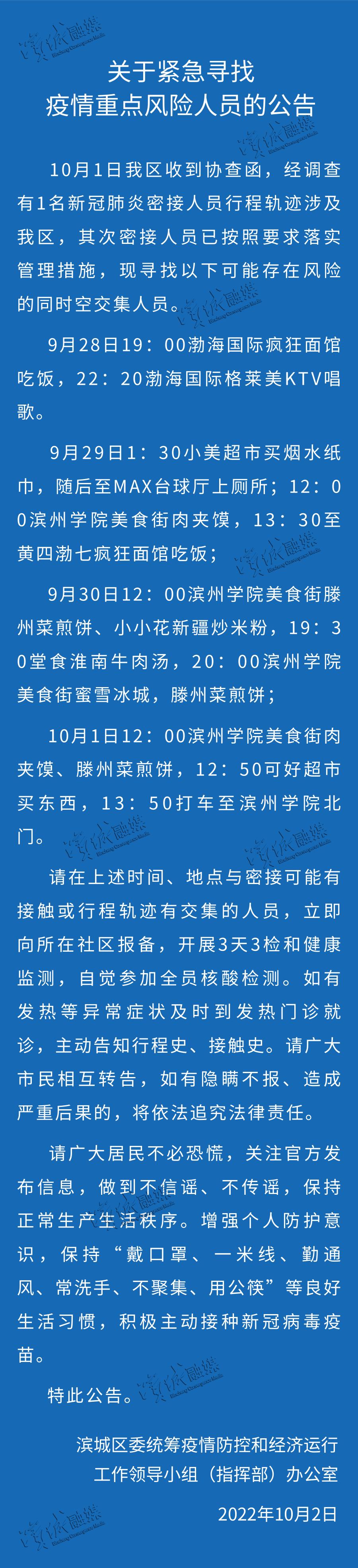 请广大市民朋友关注官方信息发布,与其活动轨迹重合的人员第一时间主动向辖区疾控部门报备并进行核酸检测,其间不乘坐公共交通工具,不前往公共场所,配合落实疫情防控措施。不信谣,不传谣。时刻绷紧疫情防控之弦,保持良好的个人卫生习惯,戴口罩、勤洗手、常通风、少聚集,做好自我健康监测,出现发热、咳嗽、乏力、嗅觉味觉减退等不适症状,请佩戴医用口罩立即前往就近的发热门诊就诊。如因隐瞒相关接触情况,造成疫情传播扩散,将依法追究相关人员法律责任。