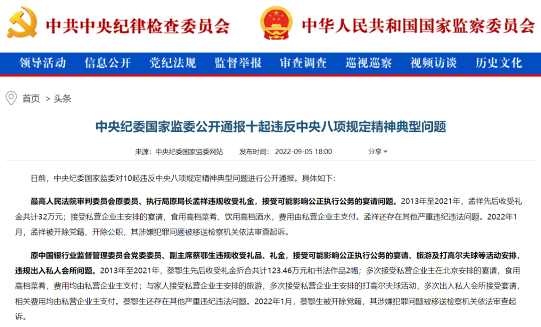 9月5日,在中秋、国庆节假到来之前,中央纪委国家监委对10起违反中央八项规定精神典型问题进行公开通报。包括:最高人民法院审判委员会原委员、执行局原局长孟祥违规收受礼金,接受可能影响公正执行公务的宴请问题;原中国银行业监督管理委员会党委委员、副主席蔡鄂生违规收受礼品、礼金,接受可能影响公正执行公务的宴请、旅游及打高尔夫球等活动安排,违规出入私人会所问题,等等。