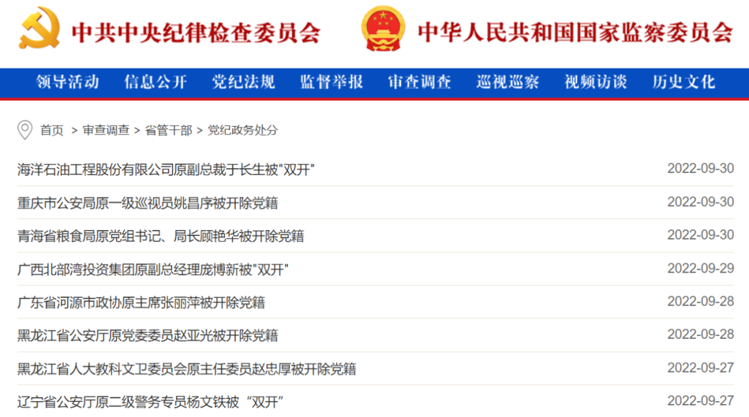 厅局级干部60名,包括:海洋石油工程股份有限公司原党委委员、副总裁于长生被开除党籍和公职;重庆市公安局原一级巡视员姚昌序严重违纪违法被开除党籍,等等。