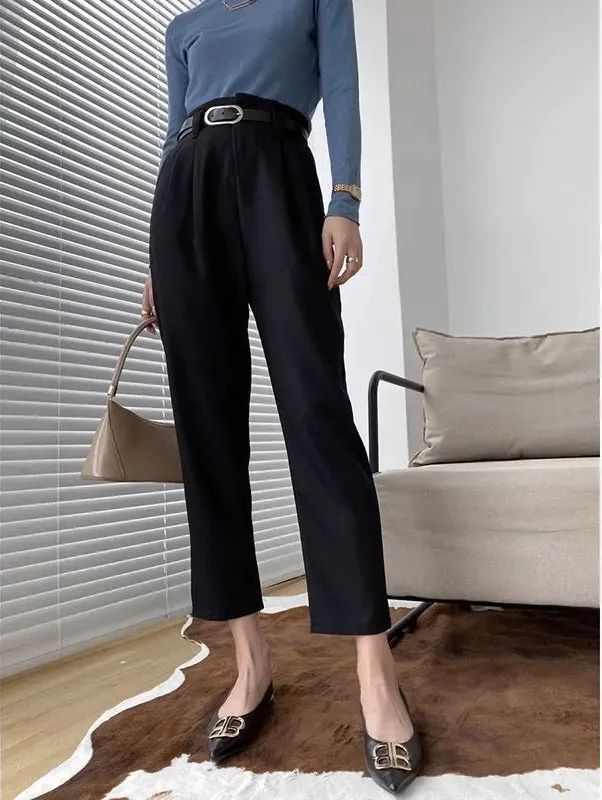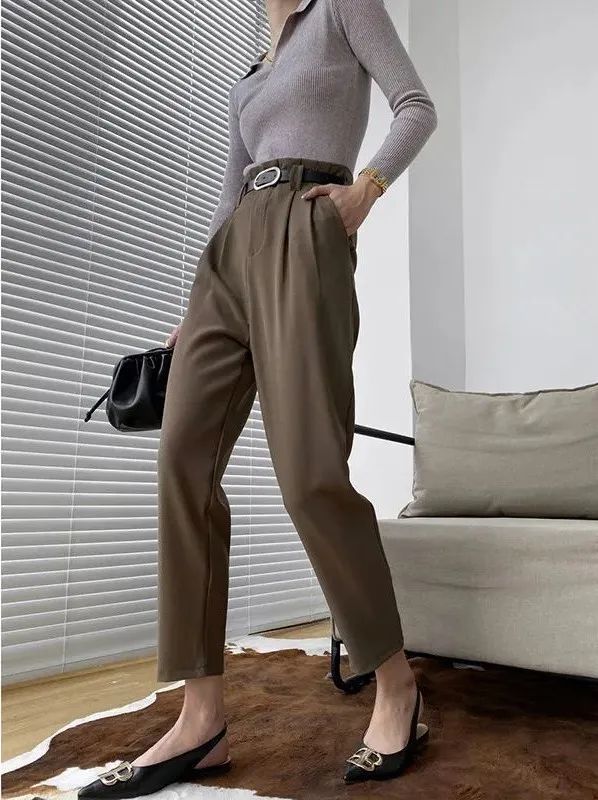法式打底衫+西装烟管裤显得特别气质优雅。腰间再适当选择一条皮带装饰,显腰身又让身材比例看着很纤细。