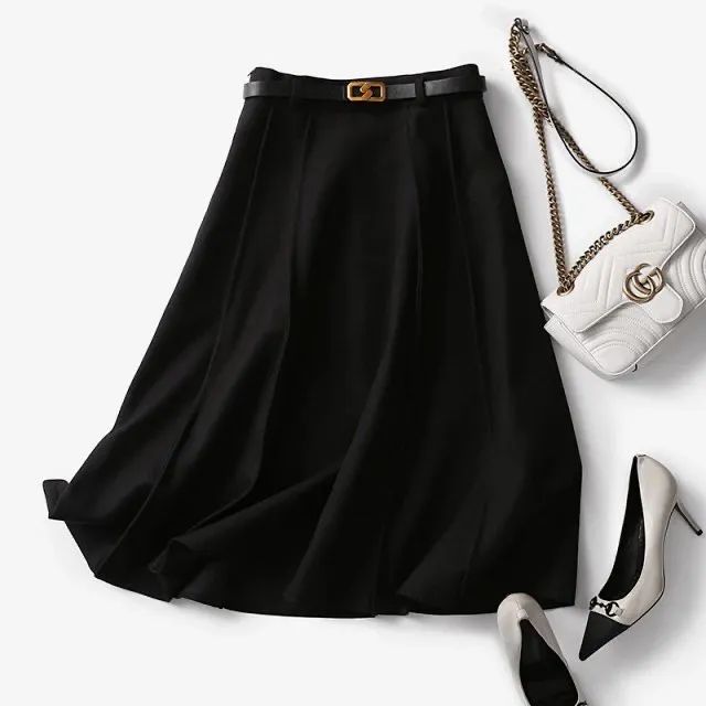 这款半身裙从腰到褶之间有一段是平的,纵向分割下来,非常显腰细+修正胯宽。腰腹稍微有点肉也没关系、能藏得好好的!