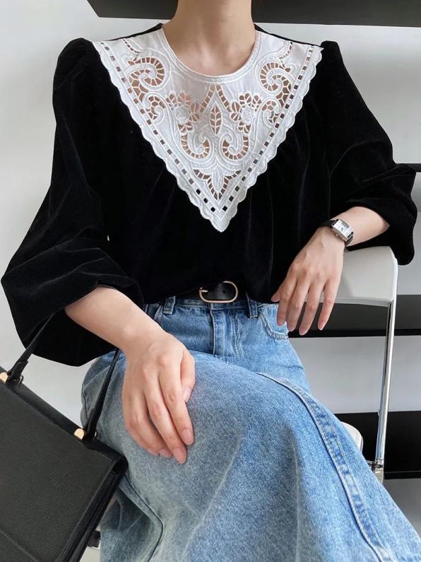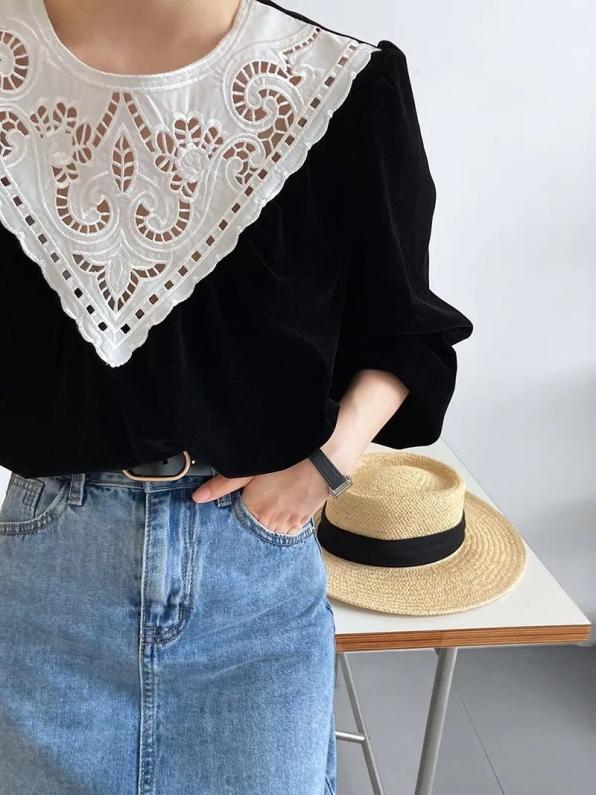 这件娃娃领衬衫,能完美遮盖身材上的缺陷。黑色系的衣服本身就是色彩中最显瘦的,加上独特的设计就算是有拜拜肉的身材,穿起来也很显瘦!