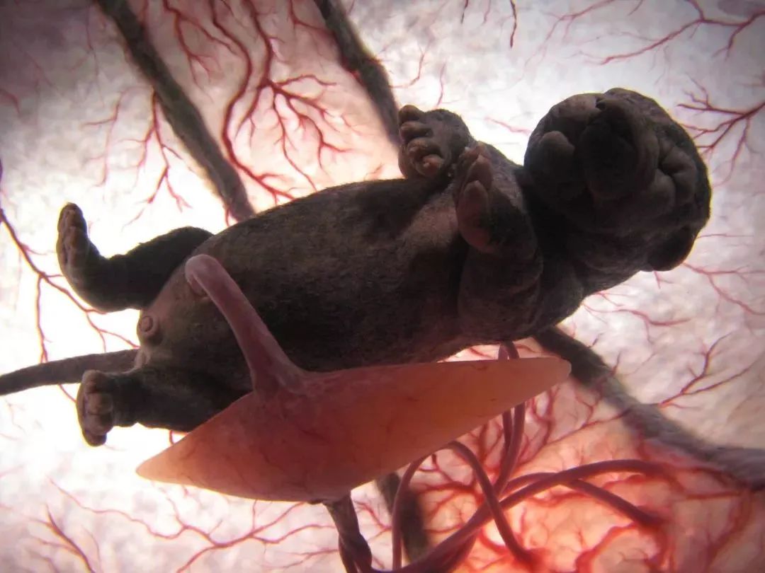它们是有胎盘,但作用有限,因为孕期非常短,大概只有30天左右(想想人类带球跑要10个月)。幼崽出生后,这团尚未成熟、花生大小的小肉团,住进妈妈的育儿袋里,脐带自然脱落,基本不会留下痕迹。