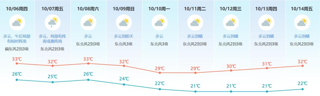 预计我市6-7日多云,局部有阵雨或雷阵雨;8-9日多云为主;9日夜间起-11日受新一股冷空气影响,多云间晴,北风加大,气温下降,早晚舒适凉爽。