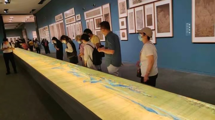 观众正在欣赏《千里江山图》。这次展览特展出放大2倍的《千里江山图》打样稿灯光特效图,匠心的独特、山河的雄壮全部铺陈。很难想象,凝萃着中国数千年历史文化的绘画珍品、散落在世界各地的传世瑰宝,能够以前所未有的形式重聚一堂,让人尽览风华。我们仿佛听见古老的颜料、纸绢和石壁在一起吟唱着穿越时空的乐章。