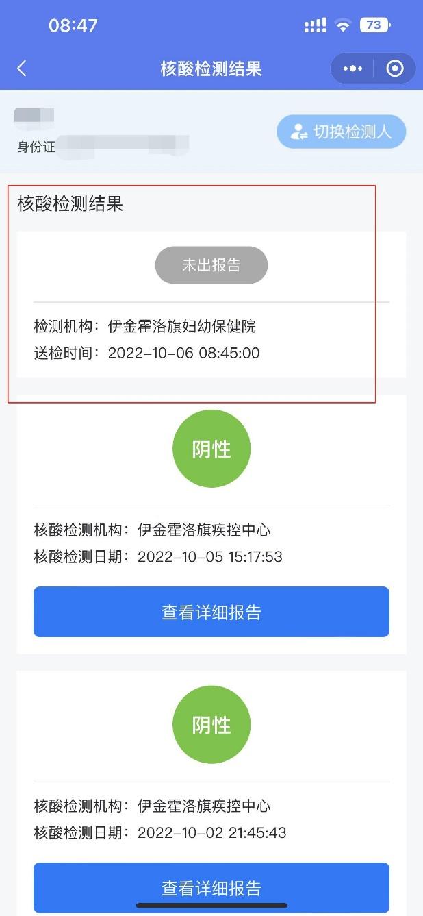 在微信中打开“健康伊金霍洛官方”小程序,进入核酸检测结果查询页面,如需查询详细报告可点击“查看详细报告”。