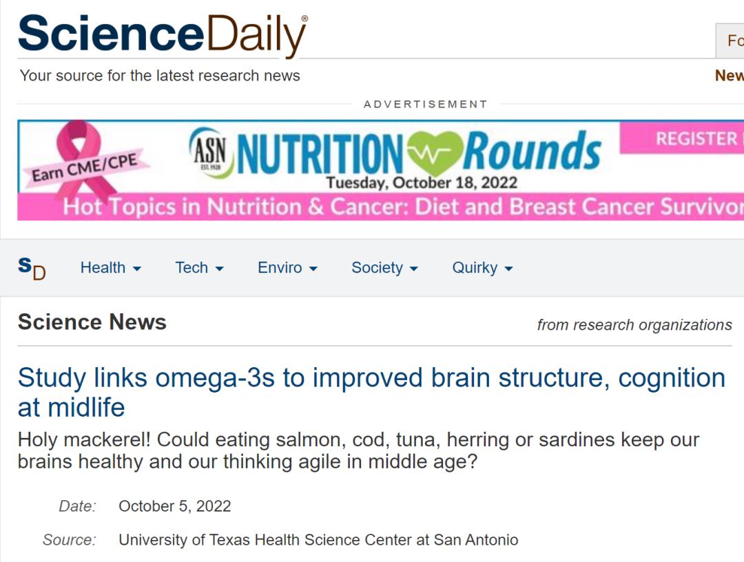 《每日科学》10月5日消息根据近日发表在美国神经病学学会(American Academy of Neurology,AAN)医学杂志《Neurology》上的研究,在 40 多岁和 50 多岁的健康研究志愿者中,红细胞中至少含有一些 omega-3 与更好的大脑结构和认知功能有关。得克萨斯大学圣安东尼奥健康科学中心(UT Health San Antonio)的研究人员和弗雷明汉心脏研究(Framingham Heart Study)的其他研究人员对此进行了分析。
