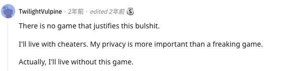 虽然内核级反作弊可能会好用,但隐私是很多人的红线。曾经就有网友宣称:“ 我宁愿和作弊者一起生活。我的隐私比游戏更重要。”