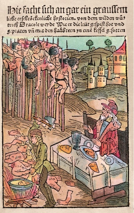 穿刺者德古拉在被刺死的囚犯前吃午饭。15世纪版画